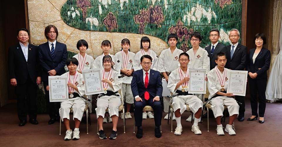 8月12日、13日に神奈川県で開催された「第十六回全国中学生少林寺拳法大会」で当道院所属で(連盟個人会員拳士)が好成績を収め、当道院をいつも陰から支えてくれる平松利英愛知県議会議員も同席いただき愛知県知事の大村様よりお祝いの言葉を頂戴しました。代表者挨拶として当道院所属の藤本凪拳士が今後の抱負を兼ねた挨拶をさせていただきました。