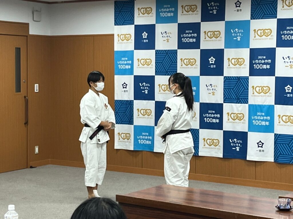 8月12日、13日に神奈川県で開催された「第十六回全国中学生少林寺拳法大会」で当道院所属で(連盟個人会員拳士)が好成績を収め、中野正康一宮市長よりお祝いの言葉を頂戴しました。代表者挨拶として当道院所属の藤本凪拳士(浅井中学校*連盟個人会員)が今後の抱負を兼ねた挨拶をさせていただきました。